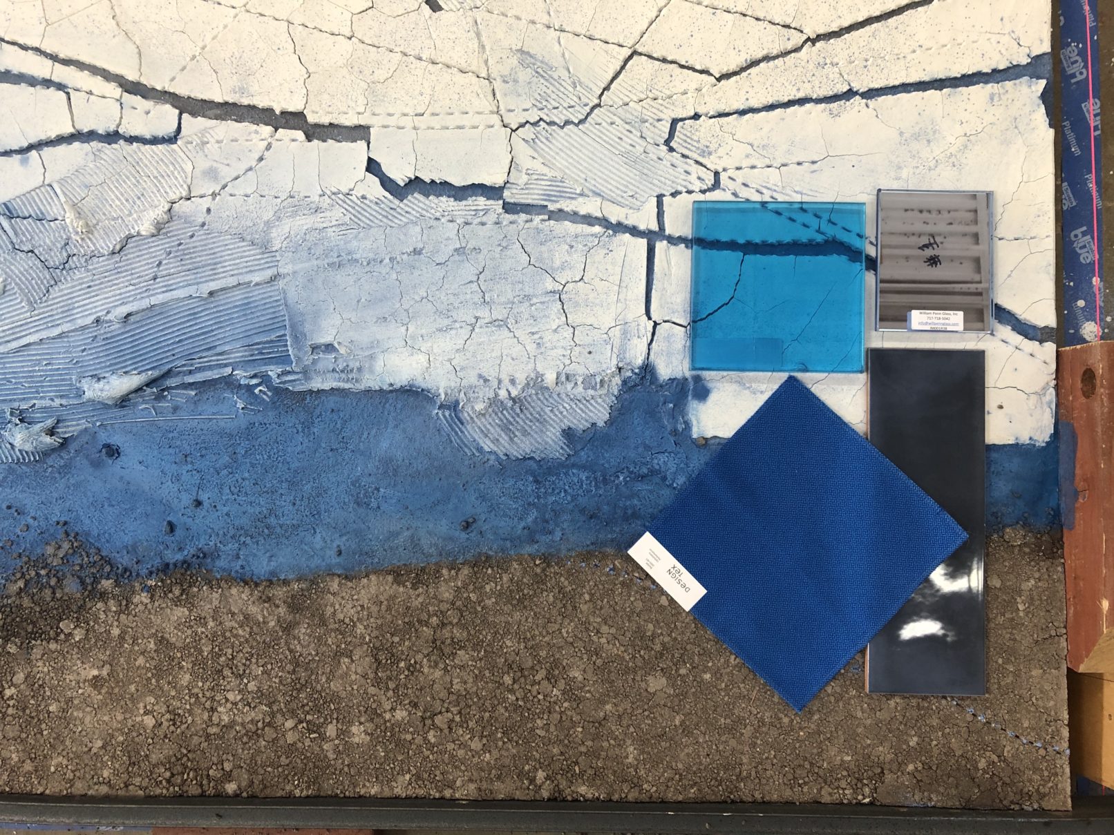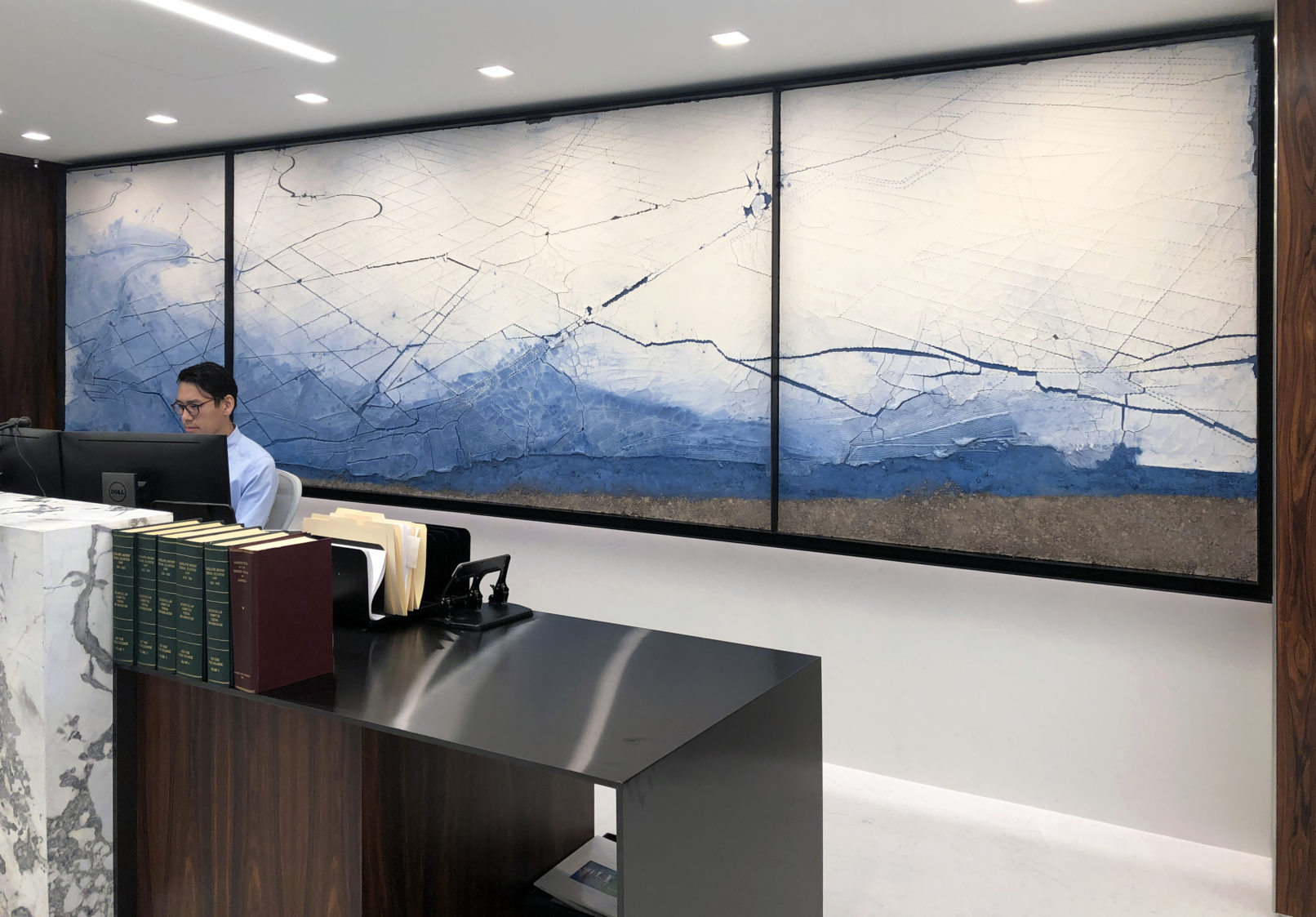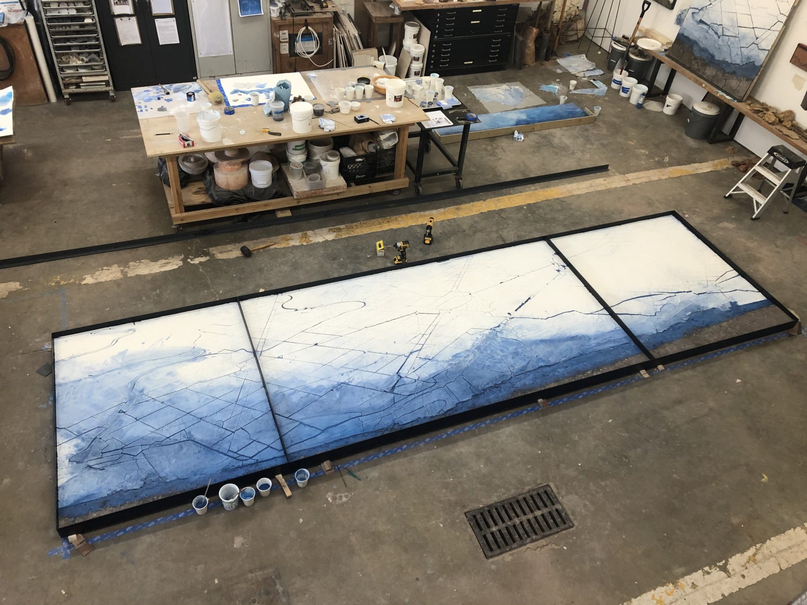 This commission came about because a designer created a proposal for their client, creating a Photoshopped image of an earlier project of mine, Tiber Creek and Other Lost Things, 2011, which used mapping of DC, and appealed to the designers for this site. They cropped and stretched picture, added a blue wash, and inserted it into a model of the proposed site.