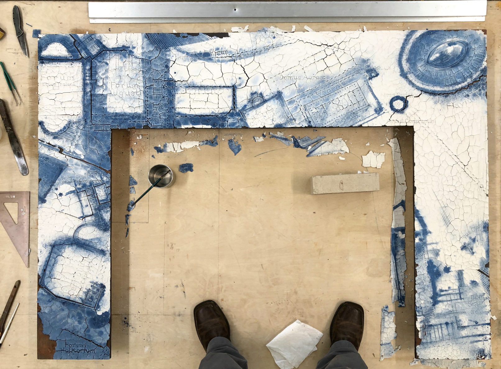 This piece continues the blueprint work that started with 2020’s Rising Tide. Here, I get to explore more cyanotype coloration, and the history of cyanotype as making possible the first blueprints… and add in a map of ancient Rome.