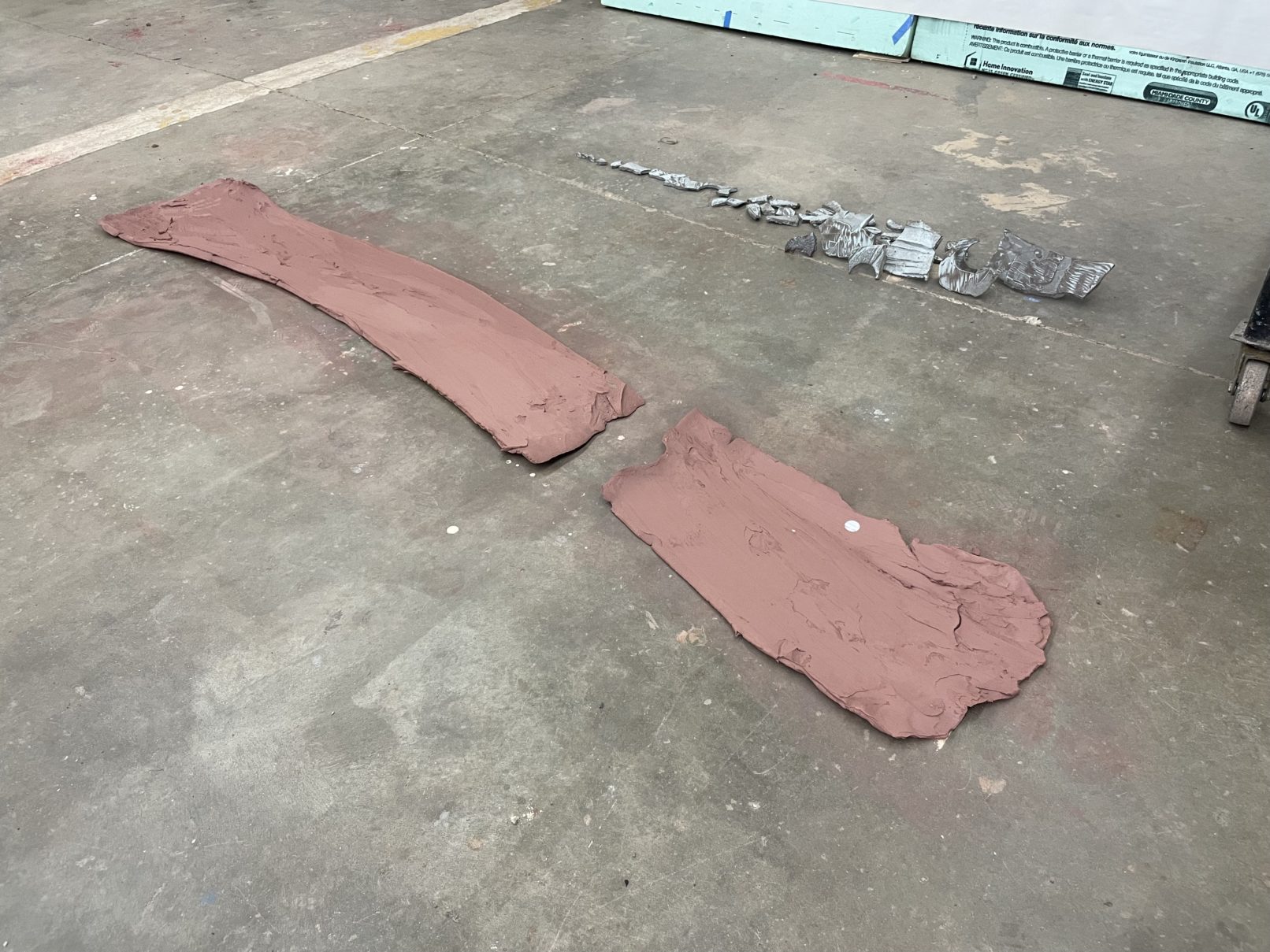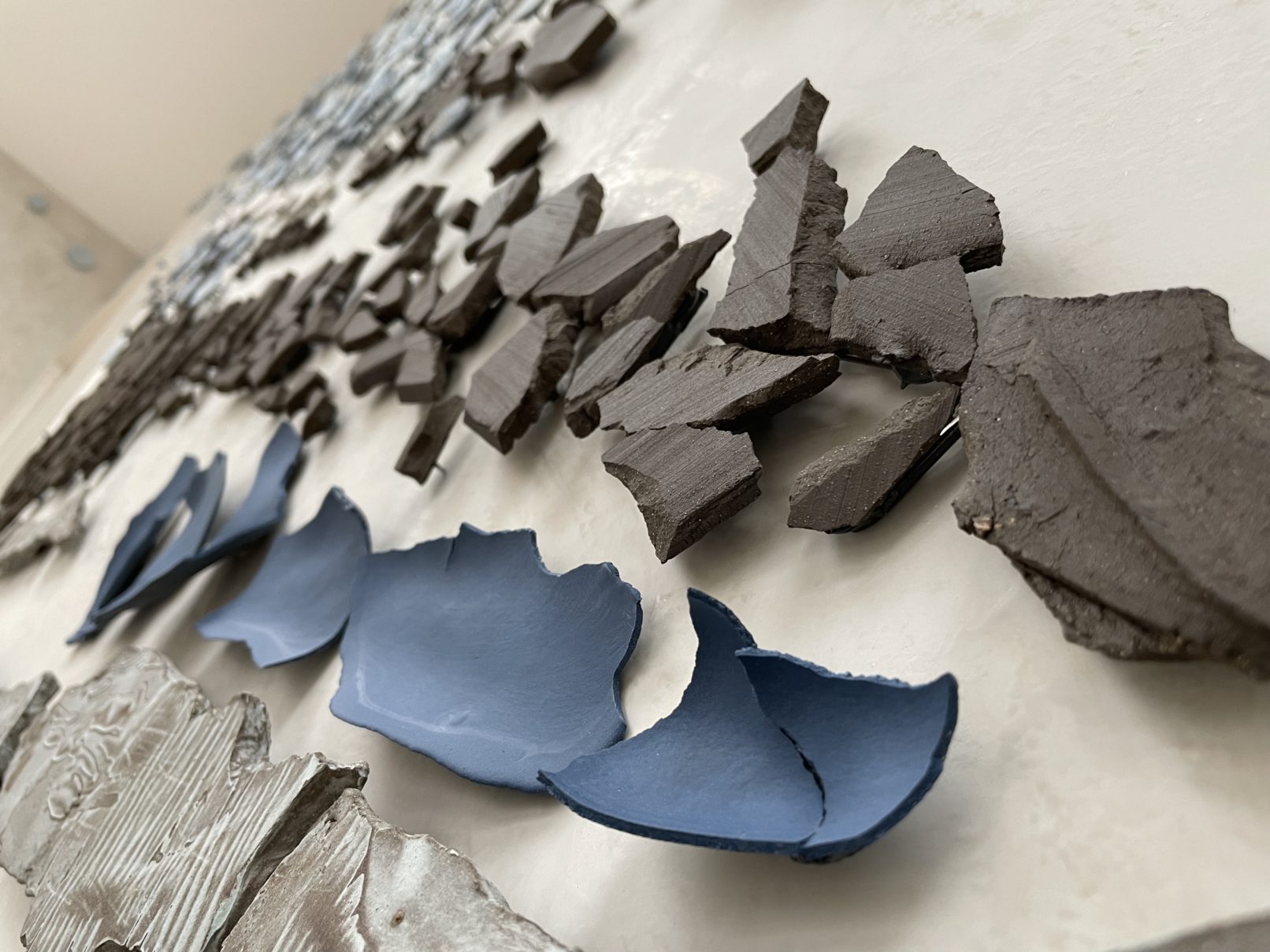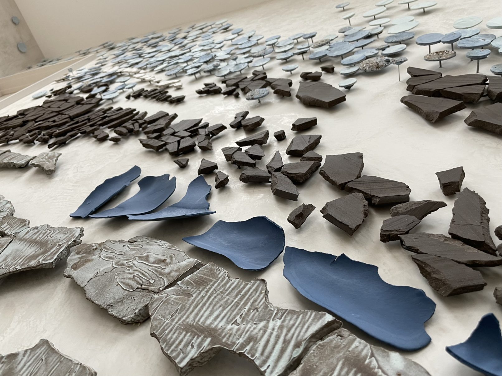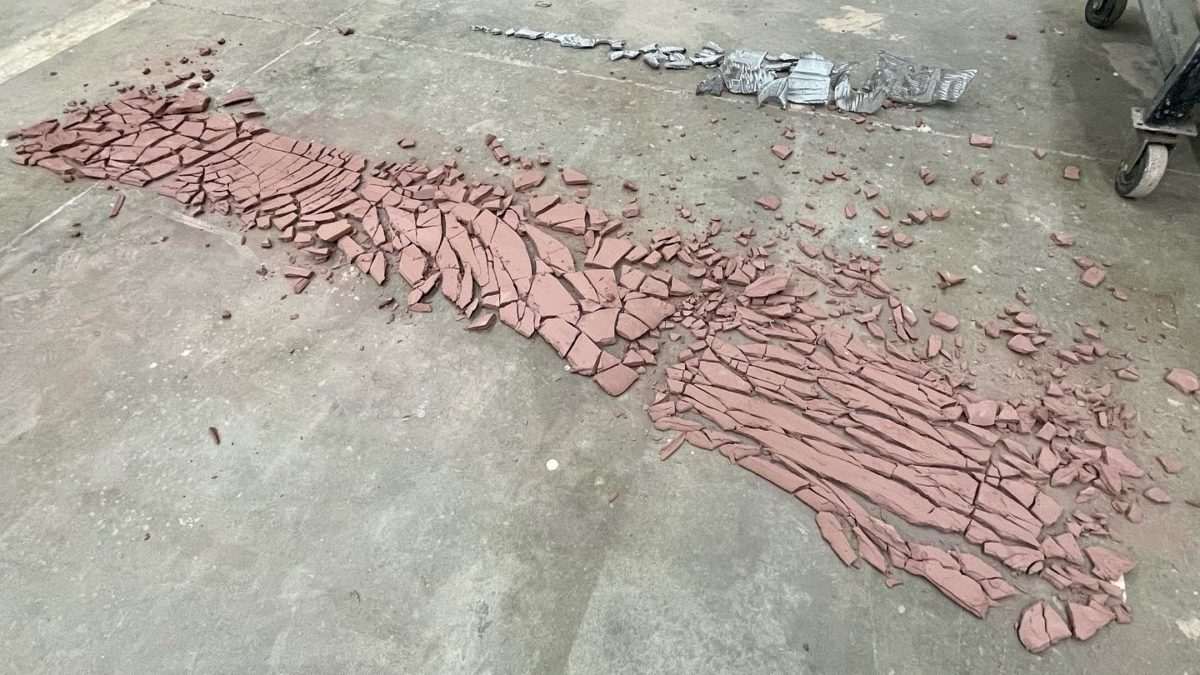 When I started working on some ideas for this piece, I was thinking a lot about The Stone of Possession, how a white European sailor could just get out of his ship, drop a big stone on an island and claim it for France. And I was also thinking about mapping the ocean floor and specifically Plate Tectonics, which was a revolutionary idea in its time (and still could get you fired from your Geology teaching job in the 1950’s). Plate Tectonics led me to thinking about earth, clay, ceramics, stress fractures, releasing inner tension, and that led me to some words from Jim Melchert, which gave me my opening move.