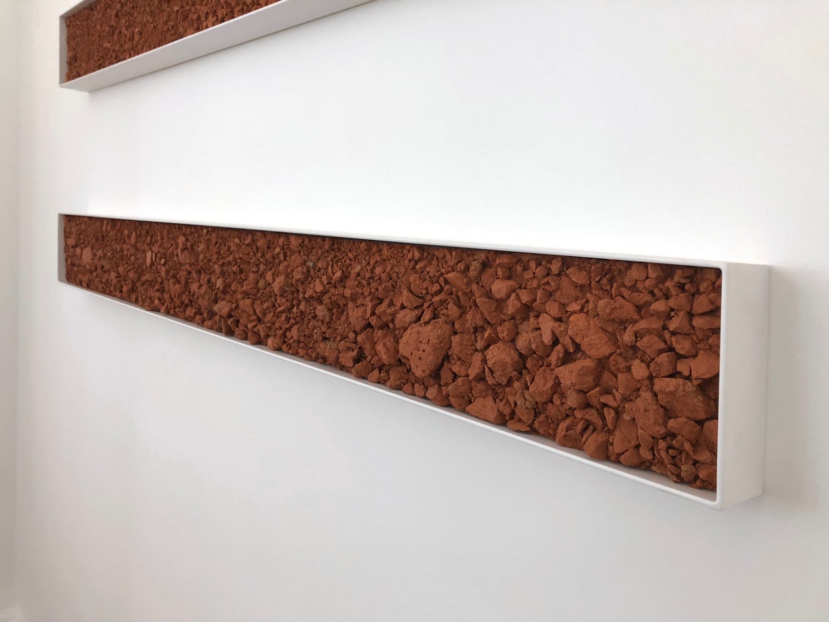 Four Bands of Red Earth, 2018 Found clay, steel 47″ tall, 48″ wide. 2″ deep (each band 48″ x 5″ x 2″)