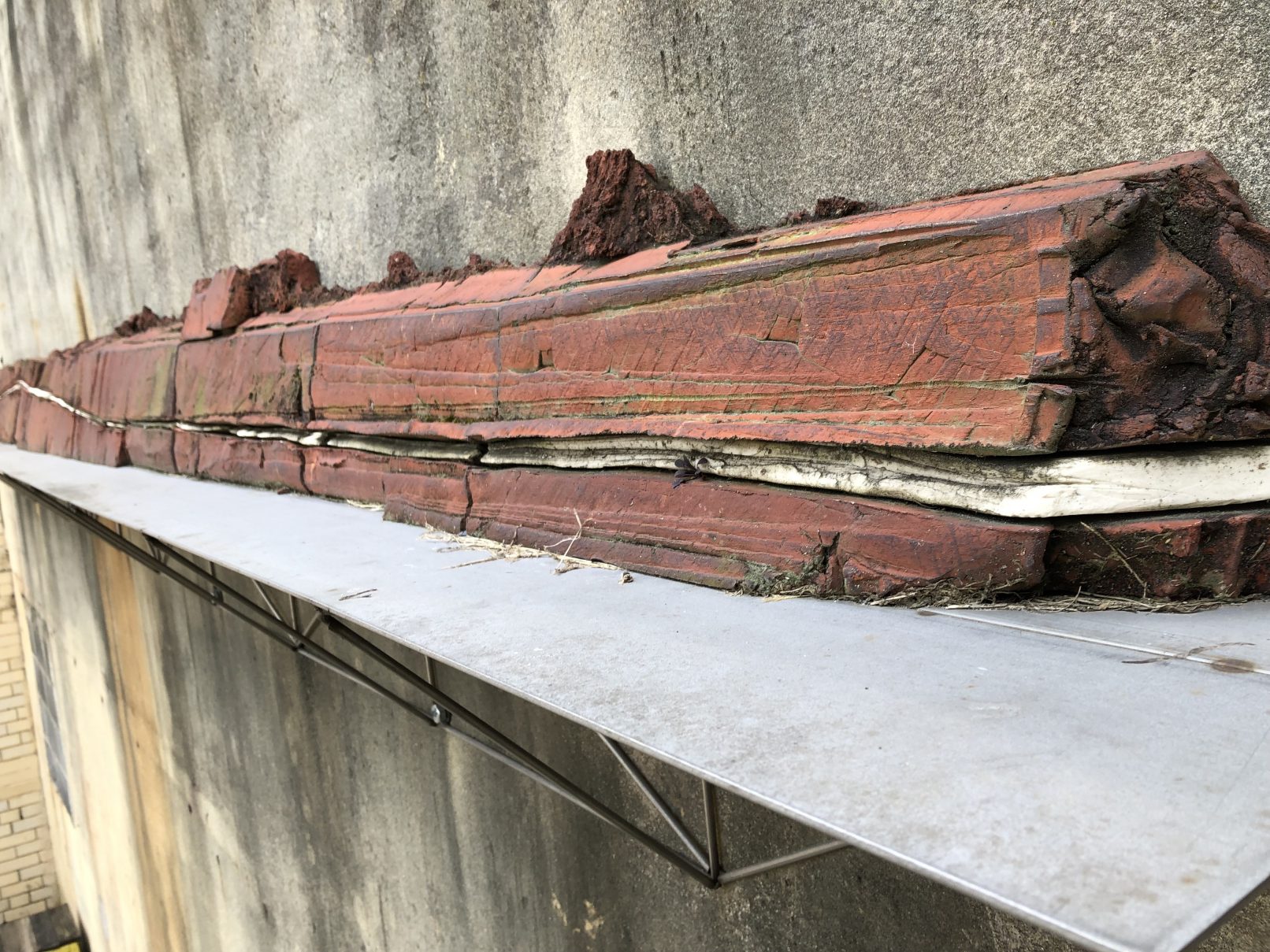 A site-specific work for Brentwood Arts Exchange, Brentwood, MD. This installation of fired local clay on a steel truss shelf is designed to be a slow-moving geologic performance. Over the span of 50-100 years (and beyond), this piece will be altered through freezing and thawing. A thin white porcelain vein, running the length of the work, bisects the red strata and forms the point of origin for stress fractures. Cracks will form; larger sections will break down into smaller parts, but generally will stay in place. The generously proportioned ledge will safely contain any pieces that may dislodge from the mass. The work is designed to take advantage of multiple viewing angles, from above grade and below grade. Size to be determined, but commensurate with site rendering.