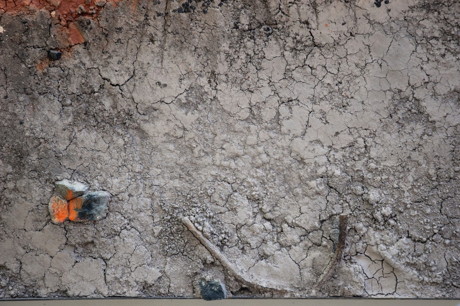 This piece was made for a lobby at 2nd and M, NE in Washington, DC. Tiber Creek (no longer in existence in DC) used to run under that site. I used demolition detritus, some red clay from the site, fragments from the new construction (gravel with spray paint) and an 1861 map of DC in the making and underpinnings of this piece. It became about things that are connected to the site, but are no longer visible.